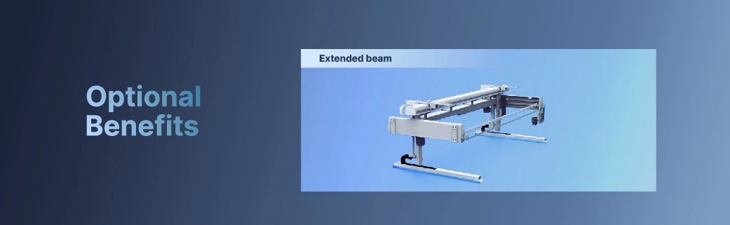 パーキングポジション付きの延長ビームをオプション装備することで、フロントサポートアセンブリを固定受動式から柔軟能動式ユニットへと進化させます。超長尺板のサポートが可能になり、たわみを防止して正確な位置決めを実現します。